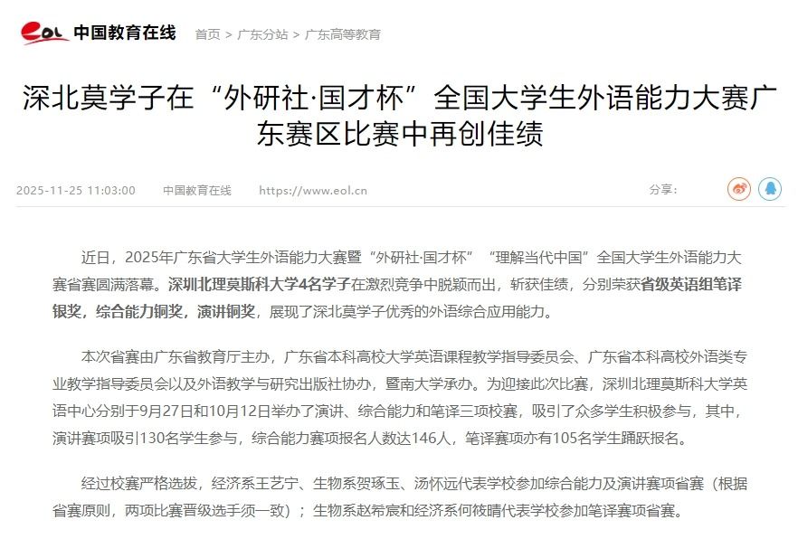 近日,2025年广东省大学生外语能力大赛暨“外研社·国才杯”“理解当代中国”全国大学生外语能力大赛省赛...