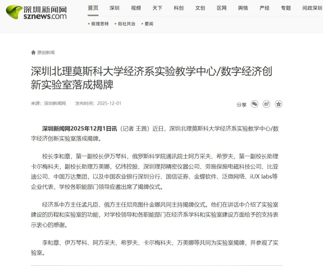 近日,深圳北理莫斯科大学经济系实验教学中心/数字经济创新实验室落成揭牌。