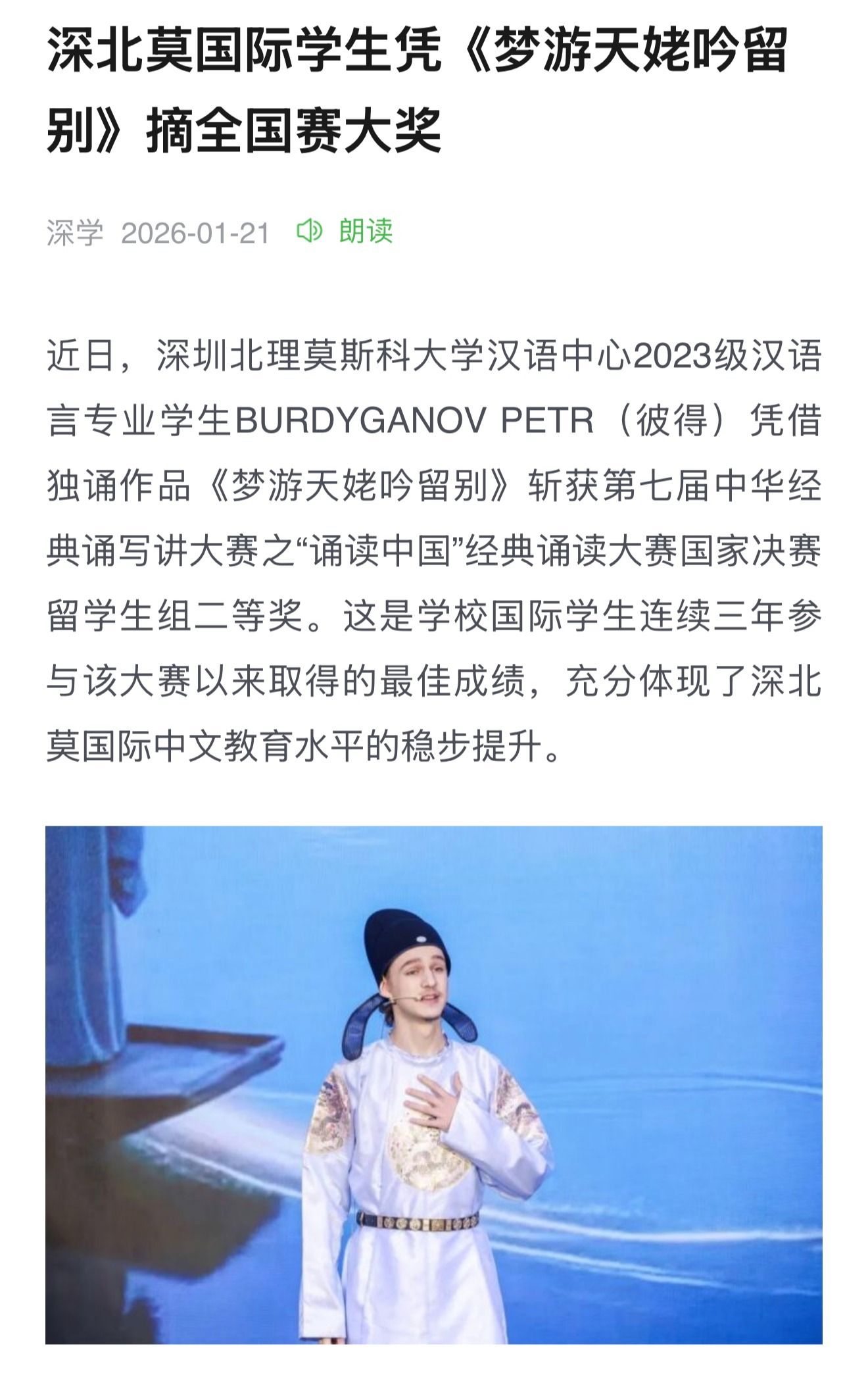 近日,深圳北理莫斯科大学汉语中心2023级汉语言专业学生BURDYGANOV PETR(彼得)凭借独诵作品《梦游天姥...
