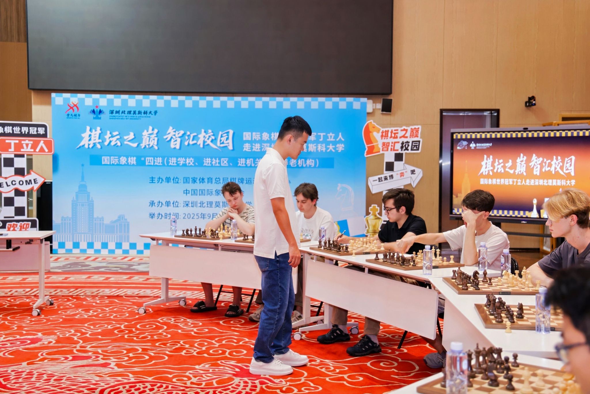9月29日,第十五届全运会国际象棋项目收官的第二天,中国首位国际象棋男子世界冠军丁立人来到深圳北理莫斯科大学,出席了以“棋坛之巅·智汇校园”为主题的活动。深圳体育群众促进中心国际象棋特聘专家教练员叶江川、刘适兰应邀参加活动,深圳北理莫斯科大学校长、党委副书记李和章,第一副校长谢尔盖·伊万琴科出席活动。这是由国家体育总局棋牌运动管理中心、中国国际象棋协会主办的国际象棋“四进(进学校、进社区、进机关、进养老机构)”的活动之一。