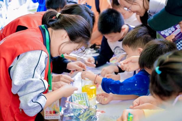 中心广场的互动区里,一个装有淡粉色浓稠液体的容器吸引了众多市民驻足,大家里三层外三层围得水泄不通。“这是什么?摸起来好软!不对,怎么又变硬了?”在志愿者的指引下,成年人与小朋友纷纷伸手一探究竟。“这是‘非牛顿流体’,它的特性是‘你越用力触碰,它就越坚硬’。” 志愿者耐心向体验者解释这一物质的科学原理。