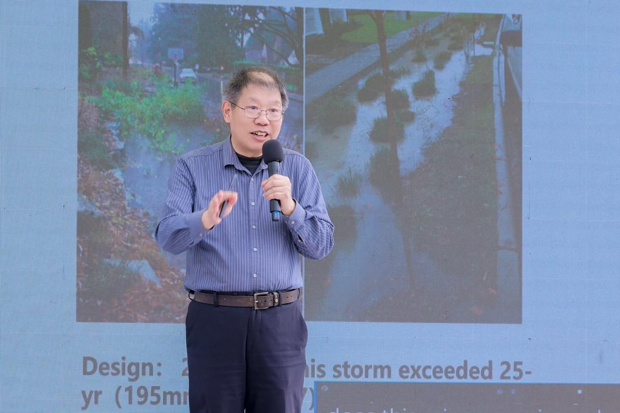珠海深圳清华大学研究院创新中心智慧海绵研究所所长、中山大学土木工程学院特聘教授佘年以《海绵城市韧性治理:通过低影响发展缓解极端天气事件》为题展开分享。他系统阐释海绵城市建设的核心目标,并分享了诸多成功案例与实践经验。佘年强调,海绵城市的核心在于破解城市内涝难题、改善水环境质量,关键在于秉持“基于自然的解决方案”理念——通过雨水花园、植草沟等分散式绿色雨水基础设施,有效恢复城市开发前的自然水文循环状态,让城市如同天然森林般具备强大的雨水吸纳与渗透能力。