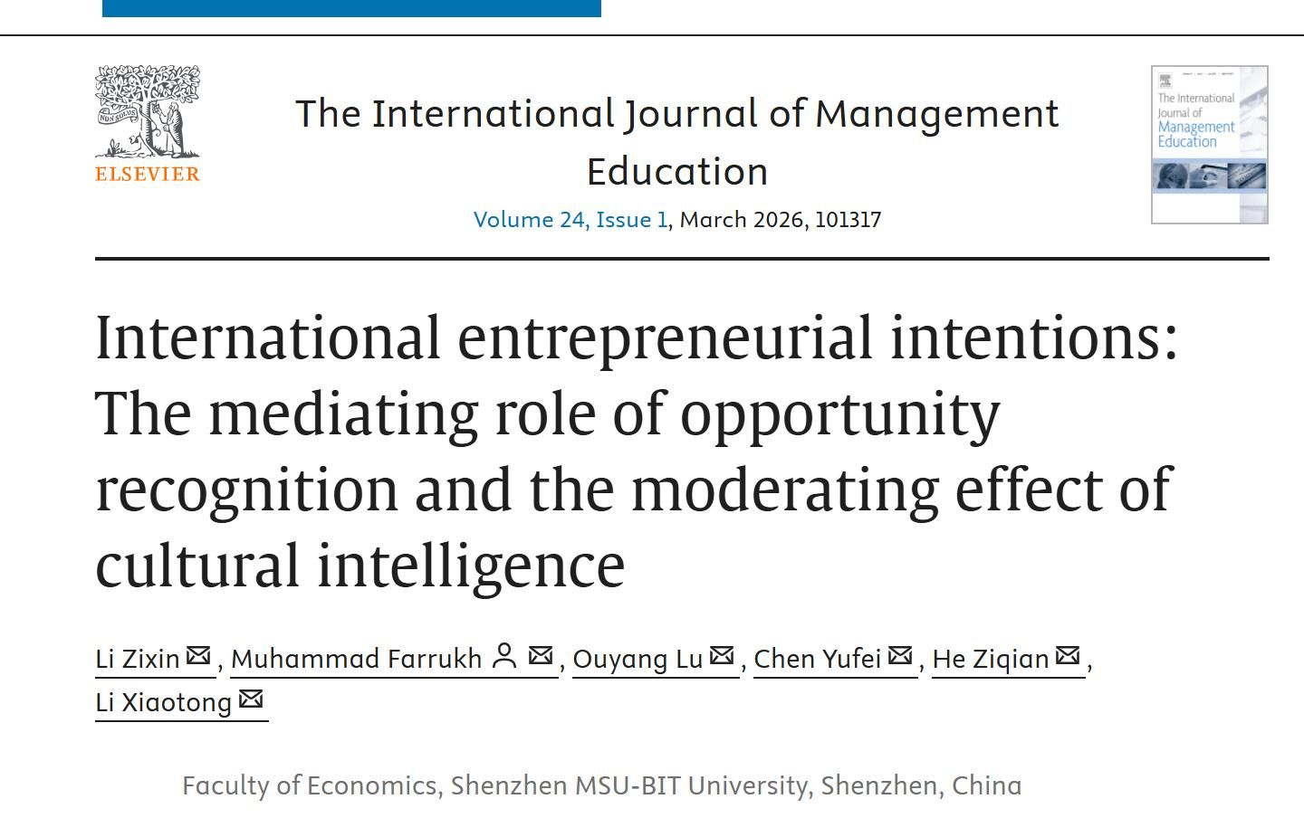 本次发表的论文题为《International Entrepreneurial Intentions: The Mediating Role of Opportunity Recognition and the Moderating Effect of Cultural Intelligence》,作者包括李子欣、欧阳璐、陈雨菲、何子谦、李晓桐,经济系Muhammad Farrukh老师担任指导教师。研究探讨了国际贸易教育如何影响学生的全球创业思维,以及机会识别能力与文化智力如何共同塑造其参与国际商业活动的意愿。论文被国际顶级期刊录用,充分体现了团队在研究设计、分析能力与学术表达方面的成熟度与严谨性。