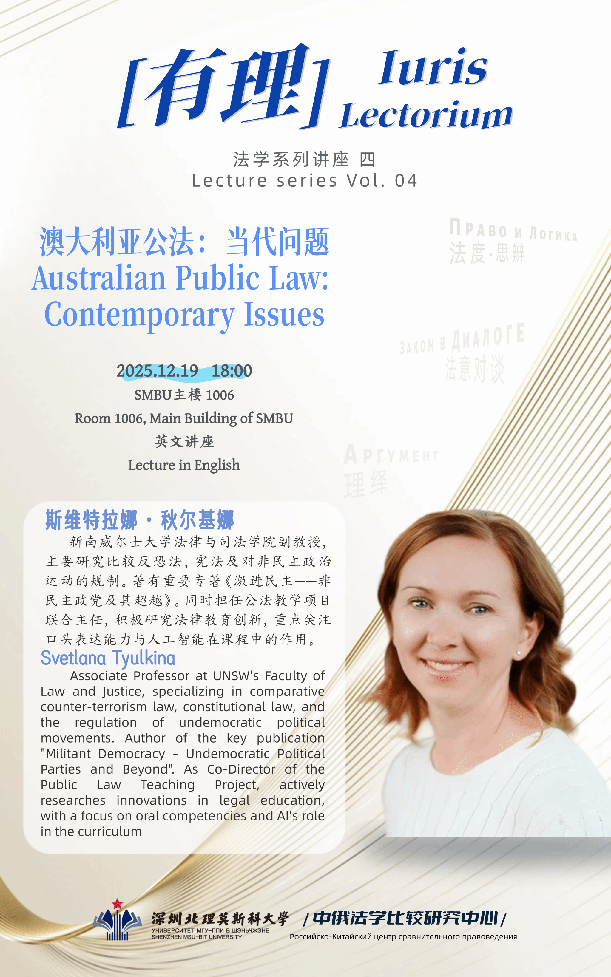 12月19日,深圳北理莫斯科大学中俄法学比较研究中心成功举办了第四期“有理lurisLectorium”法学系列讲座。本次讲座特邀新南威尔士大学法律学院副教授、公法教学项目联合主任斯维特拉娜·秋尔基娜(Svetlana Tchourkina)担任主讲嘉宾,以“澳大利亚公法的当代议题”为主题,为师生带来了一场内容翔实的学术报告。