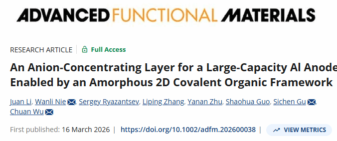 近日,深圳北理莫斯科大学材料科学系副教授谷思辰、聂万丽带领其研究团队,在材料学科顶级期刊《Advanced Functional Materials》上发表了题为“An Anion-Concentrating Layer for a Large-Capacity Al Anode Enabled by an Amorphous 2D Covalent Organic Framework(由无定型二维共价有机框架构建大容量阴离子富集涂层用于可充电铝离子电池负极)”的研究论文。该期刊最新影响因子为19.9,是材料领域的国际顶尖期刊。