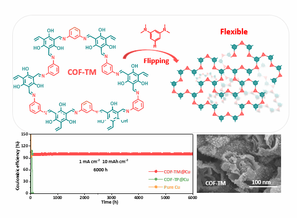 可充电铝离子电池因其铝负极具有高理论容量、储量丰富、成本低及安全性好等优势,被认为是极具潜力的下一代大规模储能技术。然而,在高面容量下充放电时,铝负极缓慢的离子传输动力学会引发严重浓差极化,进而导致枝晶生长、“死铝”形成、库仑效率下降及短路风险。本工作创新性地采用非中心对称配体与三醛基单体通过席夫碱缩合反应,合成了具有构象柔性的无定形二维共价有机框架材料,并利用其无序介孔结构及动态亚胺键,在铝负极界面特异性富集电化学活性Al₂Cl₇⁻阴离子,从而有效缓解浓差极化,稳定电极界面。基于此无定形COF涂层修饰的铝负极,研究首次实现了在10 mAh cm⁻²的大面积容量下超过7500小时的超长稳定循环。该研究为通过界面离子动力学调控提升可充电铝离子电池极性能提供了新策略。