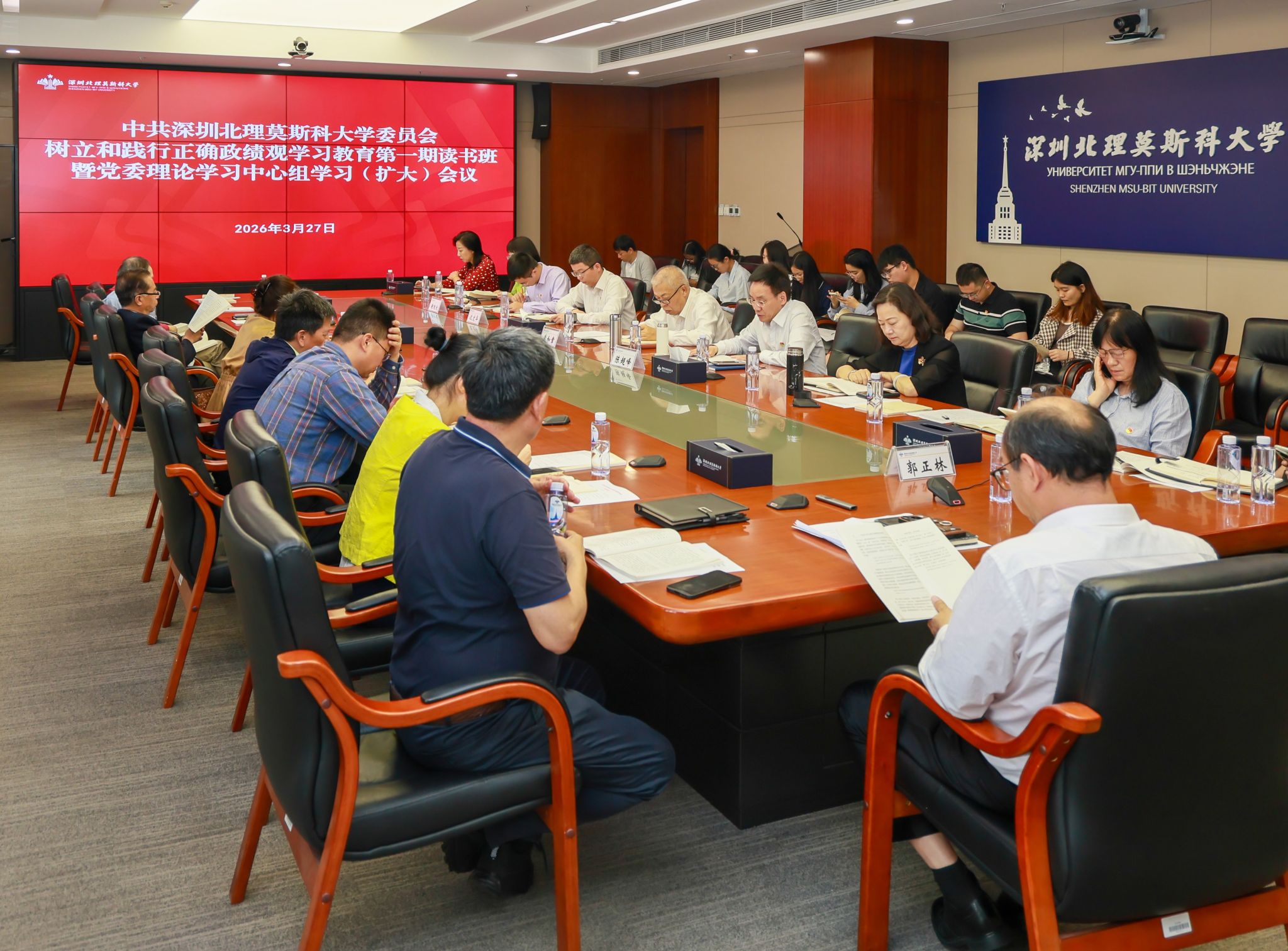 3月27日上午,深圳北理莫斯科大学党委举办树立和践行正确政绩观学习教育第一期读书班暨党委理论学习中心组学习(扩大)会议。党委班子成员、中层以上党员干部、党支部书记参加会议。