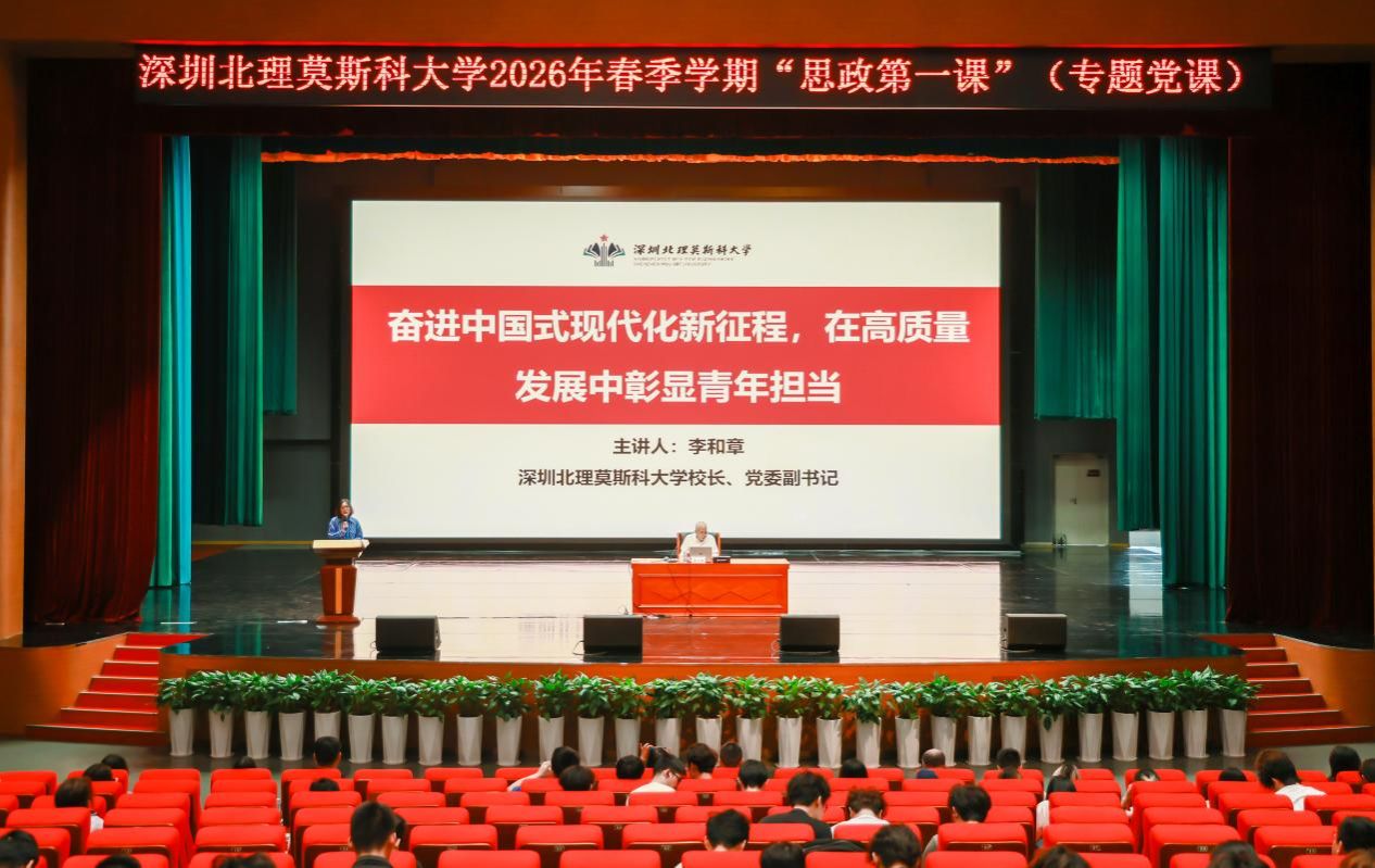 4月12日,深圳北理莫斯科大学2026年春季学期“思政第一课”在学校礼堂开讲。校长、党委副书记李和章教授以《奋进中国式现代化新征程,在高质量发展中彰显青年担当》为题,为2025级全体本科生、思政课教师及专职辅导员带来了一堂兼具理论高度与青年温度的专题党课,活动由学生工作部部长张杨主持。学校办公室、马克思主义学院、团委等单位负责同志出席本次活动。
