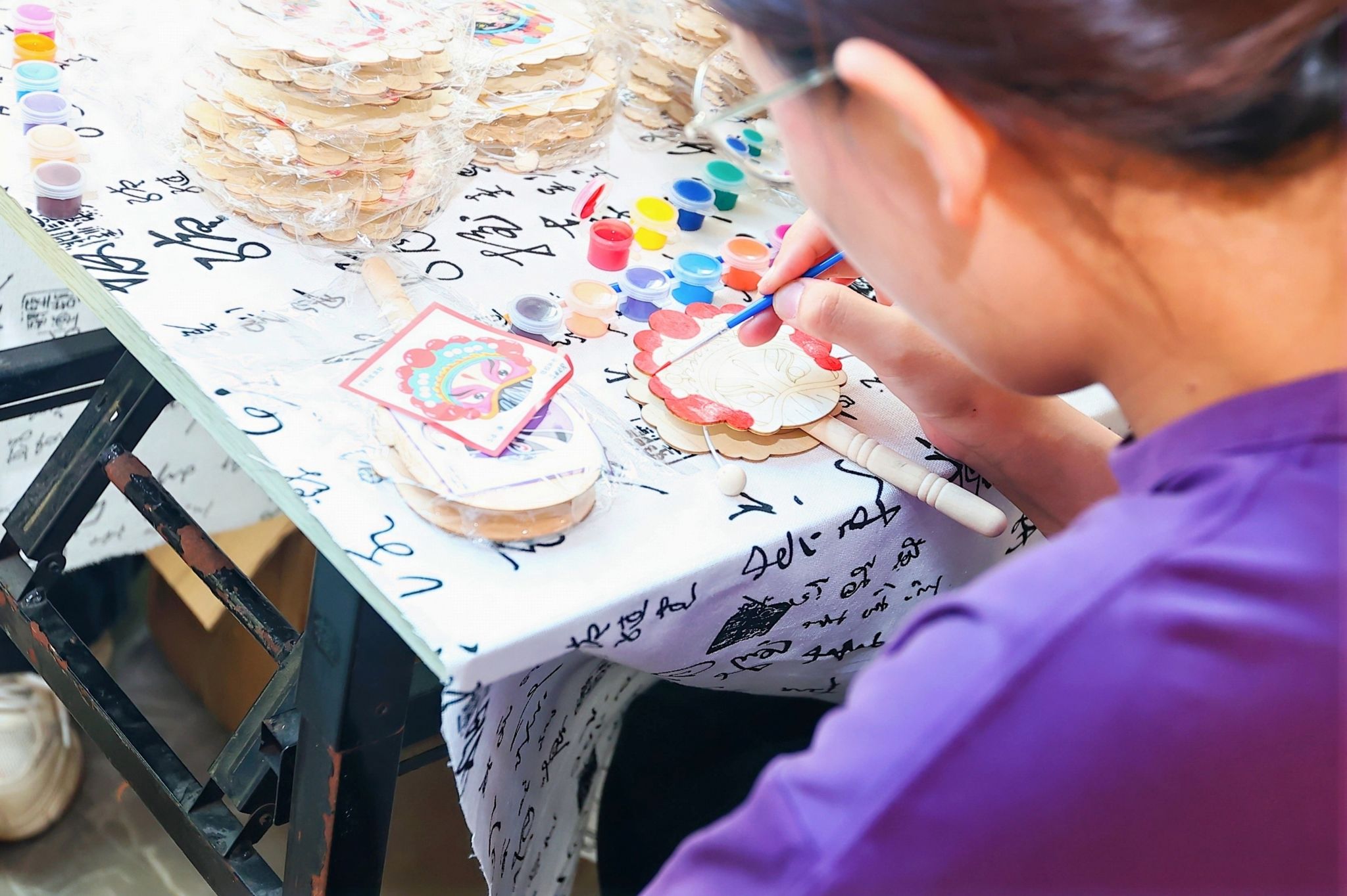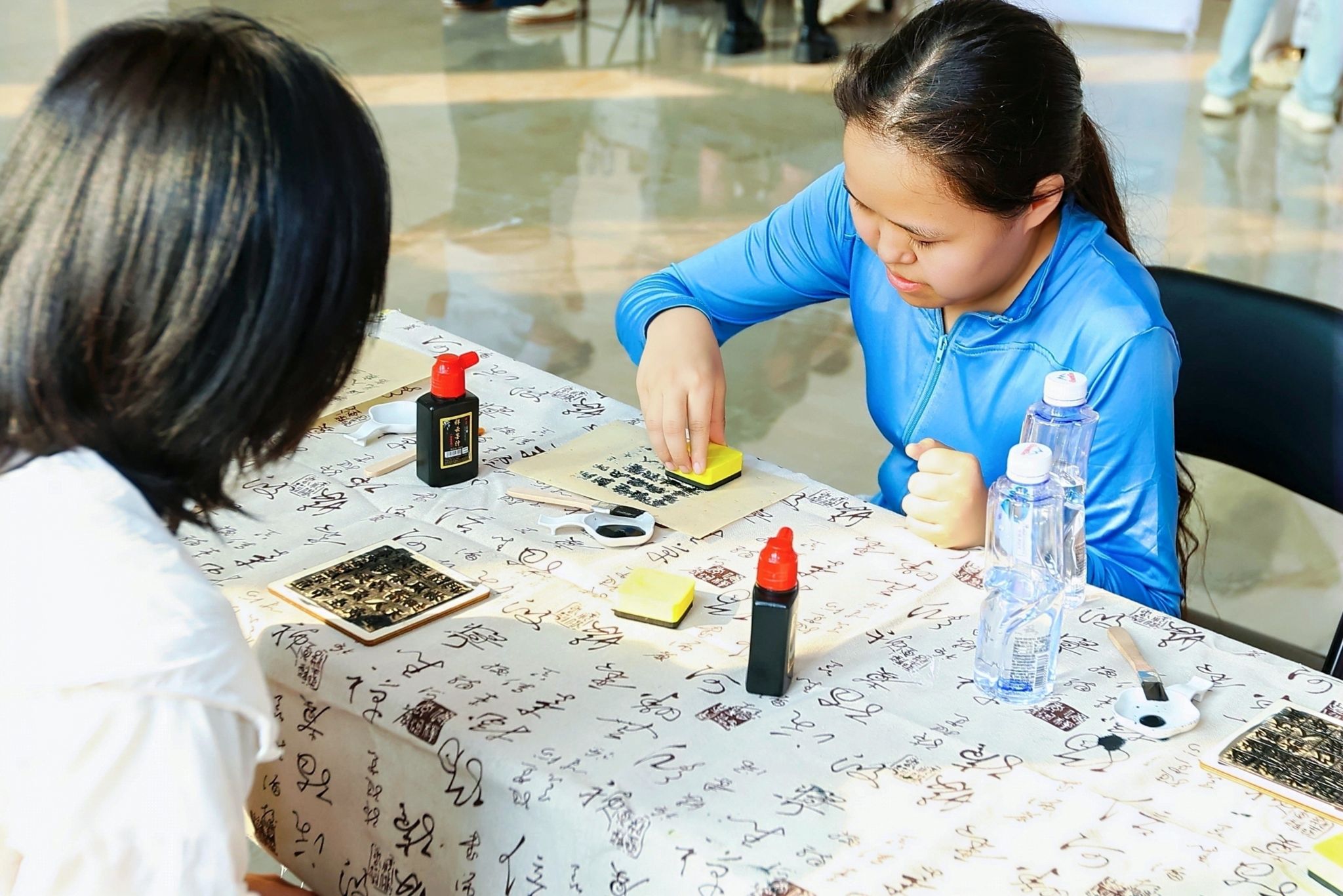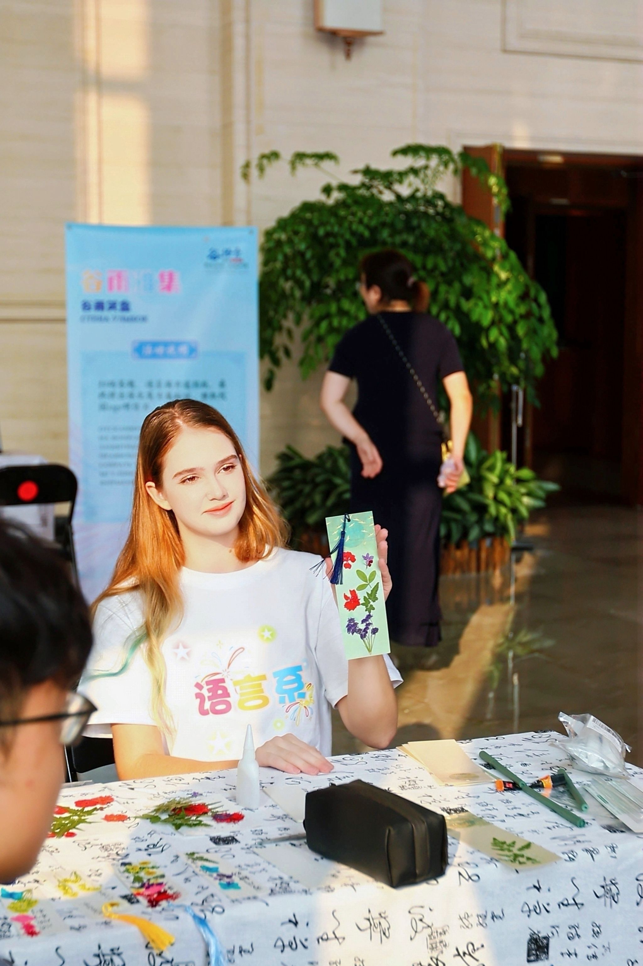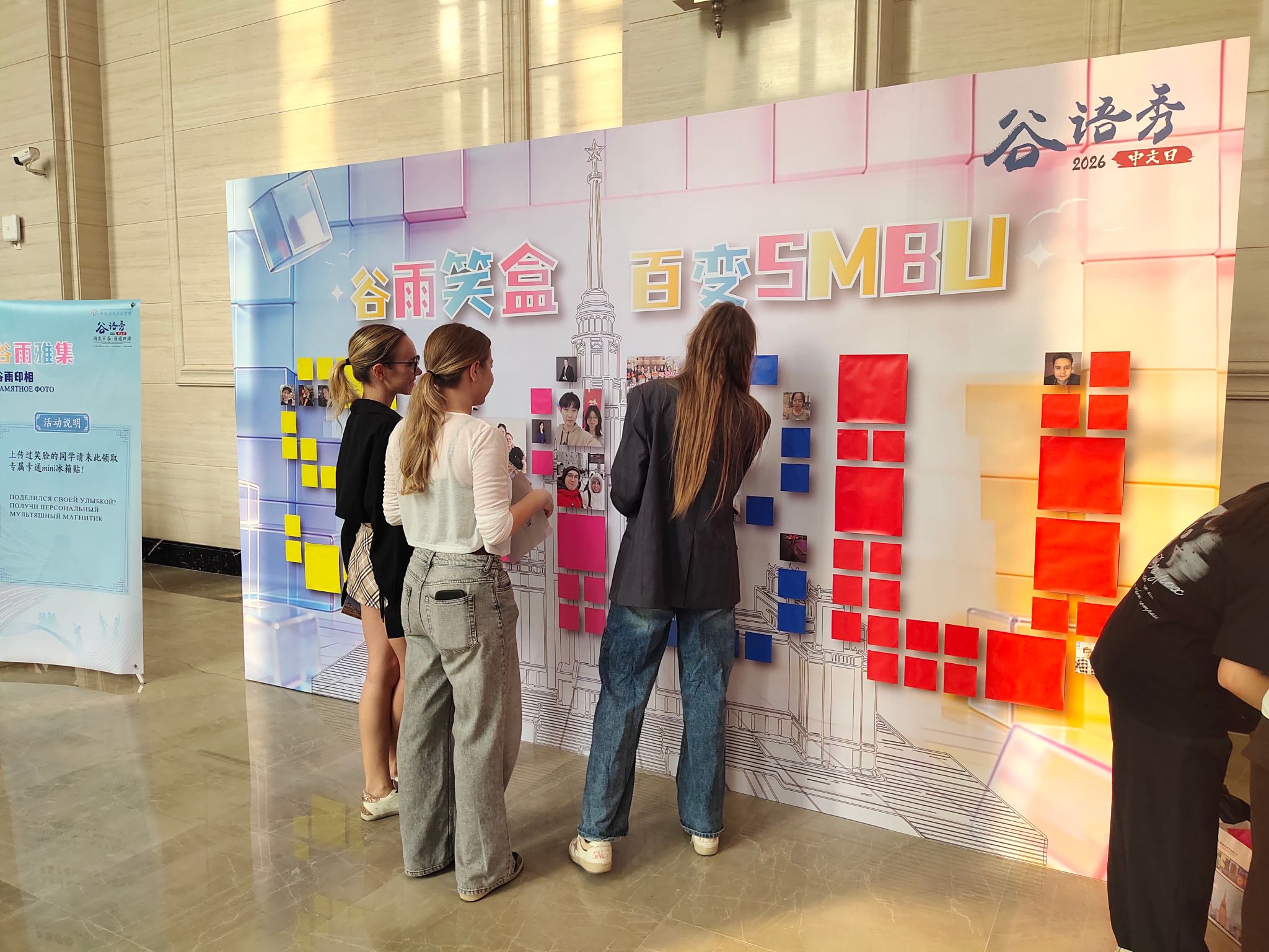 “谷语秀”才艺晚会是学校庆祝2026国际中文日的主体活动。除此之外,学校还举办了“谷雨笑盒·百变SMBU”“谷雨密语·汉字寻宝”“谷雨雅集”三项文化共创体验活动,吸引百余名中外学生积极参与。同学们上传微笑自拍,或遍寻校园各处,集字解密,让整个校园成为沉浸式文化体验空间。在“谷雨雅集”现场,参与前期共创活动的同学现场领取专属纪念礼品,并共同揭开SMBU笑脸墙的神秘面纱。现场还设置了丰富的文化体验摊位:同学们身着华夏衣裳,亲手制作干花书签,体验雕版拓印,并绘制俄罗斯套娃和中国京剧脸谱,共同体验东方韵味与俄式风情。