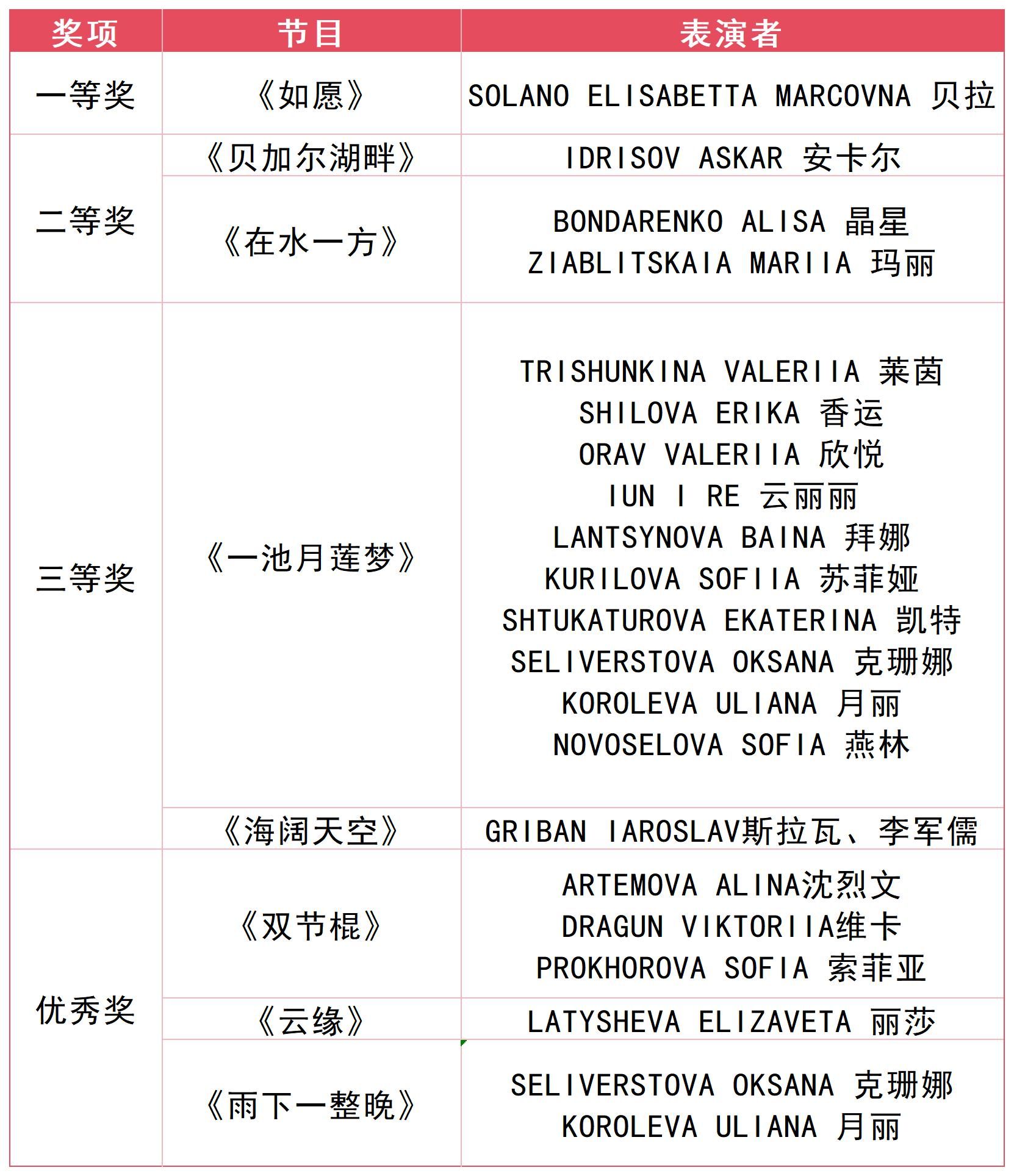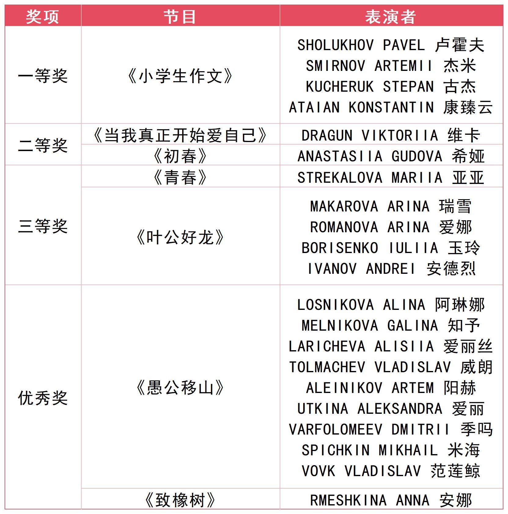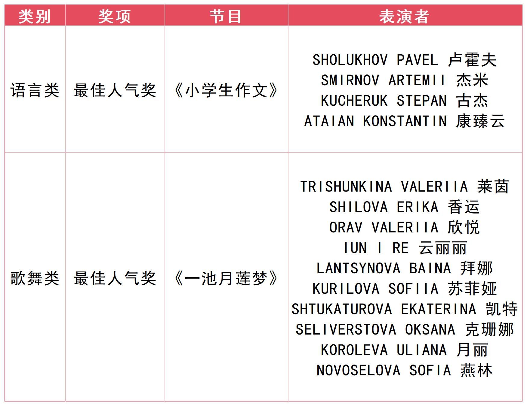 本届“谷语秀”才艺晚会节目按照语言、歌舞两类分别评选奖项。经过专家现场打分和线上限时投票,2024级材料系SMIRNOV ARTEMII(杰米)、语言系ATAIAN KONSTANTI(康臻云)等四位同学的小品《小学生作文》同时斩获语言类一等奖和最佳人气奖。2024级东方学专业SOLANO ELISABETTA MARCOVNA(贝拉)的独唱《如愿》荣获歌舞类一等奖。2024级汉语言专业TRISHUNKINA VALERIIA(莱茵)、SHILOVA ERIKA(香运)等十位同学的《一池月莲梦》获得歌舞类最佳人气奖。