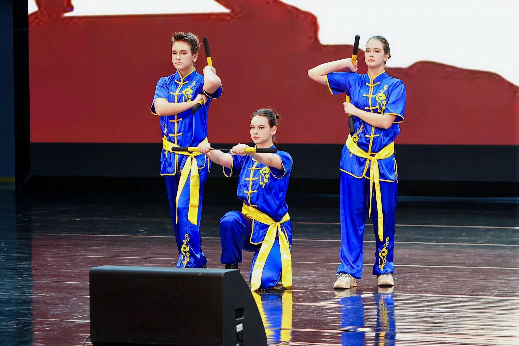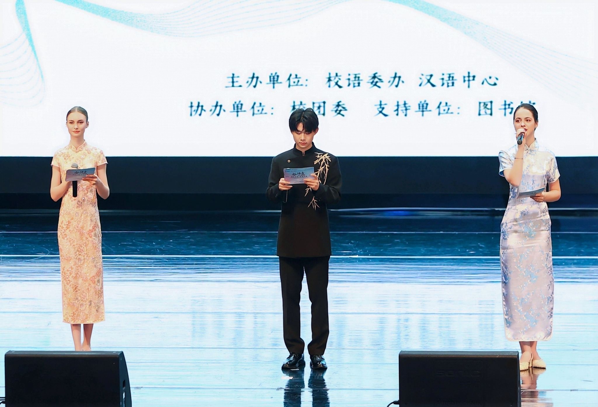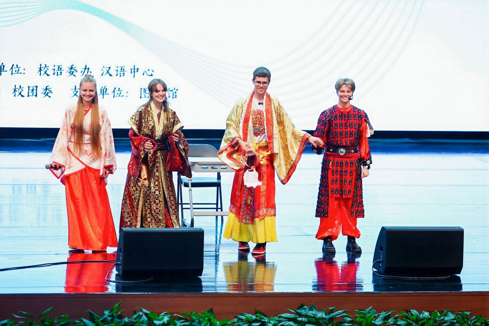 本次“谷语秀”节目形式丰富,水准颇高。经过一个多月的精心筹备与紧张排练,来自全校各院系、中心的40余名国际学生带来了涵盖歌舞、朗诵、小品、短剧、合唱等15个精彩节目。晚会由2025级语言系张雨辰、2024级东方学专业Novozhilova Sofia、2024级语言系硕士Brusentsova Anna三位中俄学子联袂主持。开场节目武术表演《双节棍》动作刚劲利落,尽显中华武术的飒爽英姿。