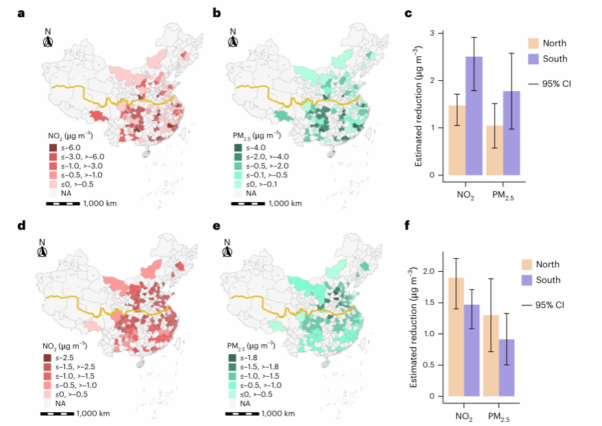 研究核心发现,充电量每提升10%,NO₂降低约0.08%,PM2.5降低约0.04%。在2016年至2023年的8年间,全国NO₂和PM2.5的下降趋势中,,电动汽车的使用分别贡献了约41%和17%。特别是在极端低温(低于7℃)的条件下,环境效益更为显著——NO₂可降低0.45%,PM2.5降低0.4%。南方城市因电动汽车利用率更高,减排效果优于北方。研究同时发现,电动汽车使用对(O₃)整体无显著影响(图2展示了因果推断的回归结果)。