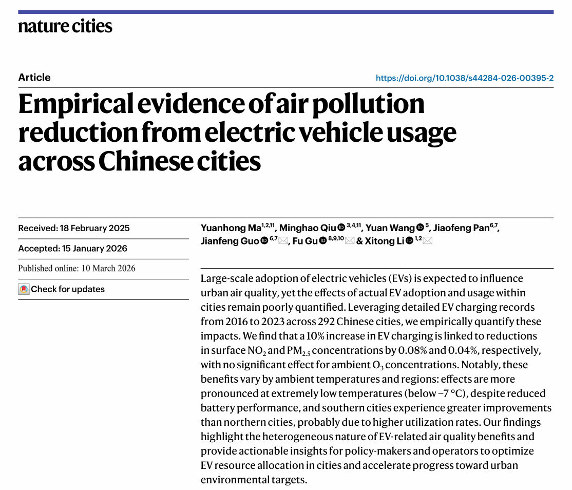 近日,深圳北理莫斯科大学人工智能研究院教授、广东省社会计算与精神卫生工程技术研究中心主任李喜彤和研究团队,在Nature子刊《Nature Cities》发表题为“Empirical evidence of air pollution reduction from electric vehicle usage across Chinese cities”(中国城市电动汽车使用对空气污染减排的实证证据)的研究论文。该期刊为Nature于2024年创刊的旗舰子刊,聚焦城市科学与可持续发展前沿。