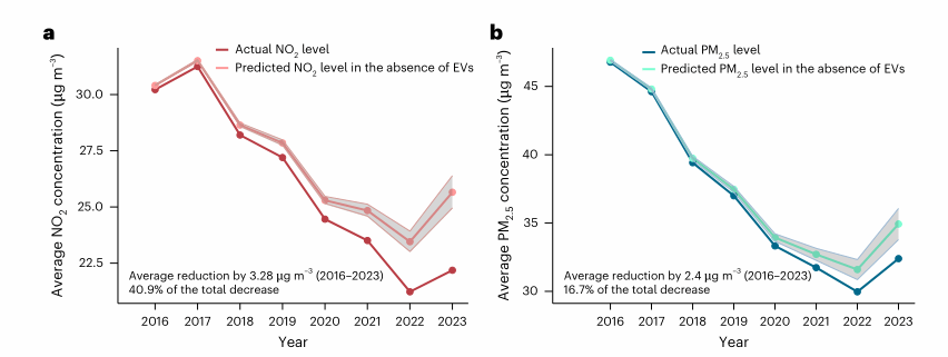 图3:有无电动汽车部署情景下2016-2023年NO₂与PM2.5浓度预测对比